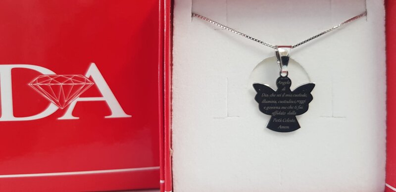 Damiano Argenti, collana in argento a forma di angelo con descrizione preghiera