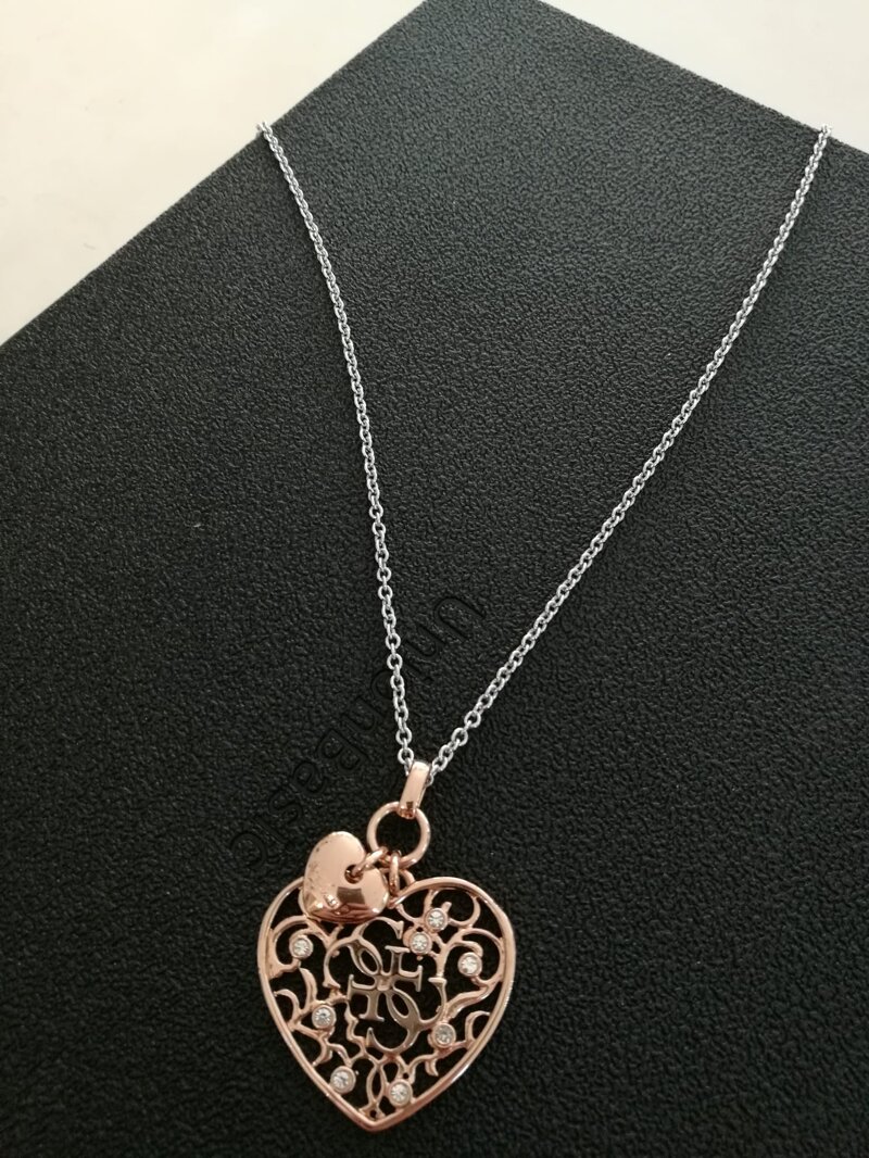 Collana donna Guess in acciaio con catena color argento e pendente a forma di cuore rosato abbellito da zirconi, lunghezza 80 cm.