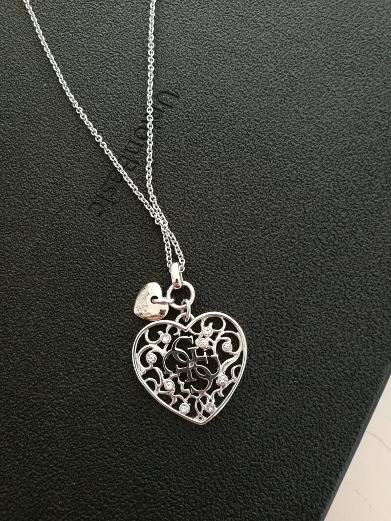 Collana donna Guess in acciaio color argento con pendente a forma di cuore abbellito da zirconi, lunghezza 80 cm.