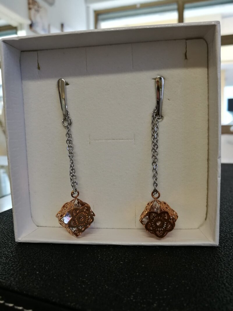 Orecchini donna 4You in acciaio, pendenti, impreziositi da fiori traforati che costituiscono un cubo con all'interno un cristallo di vetro, lunghezza 7 cm.